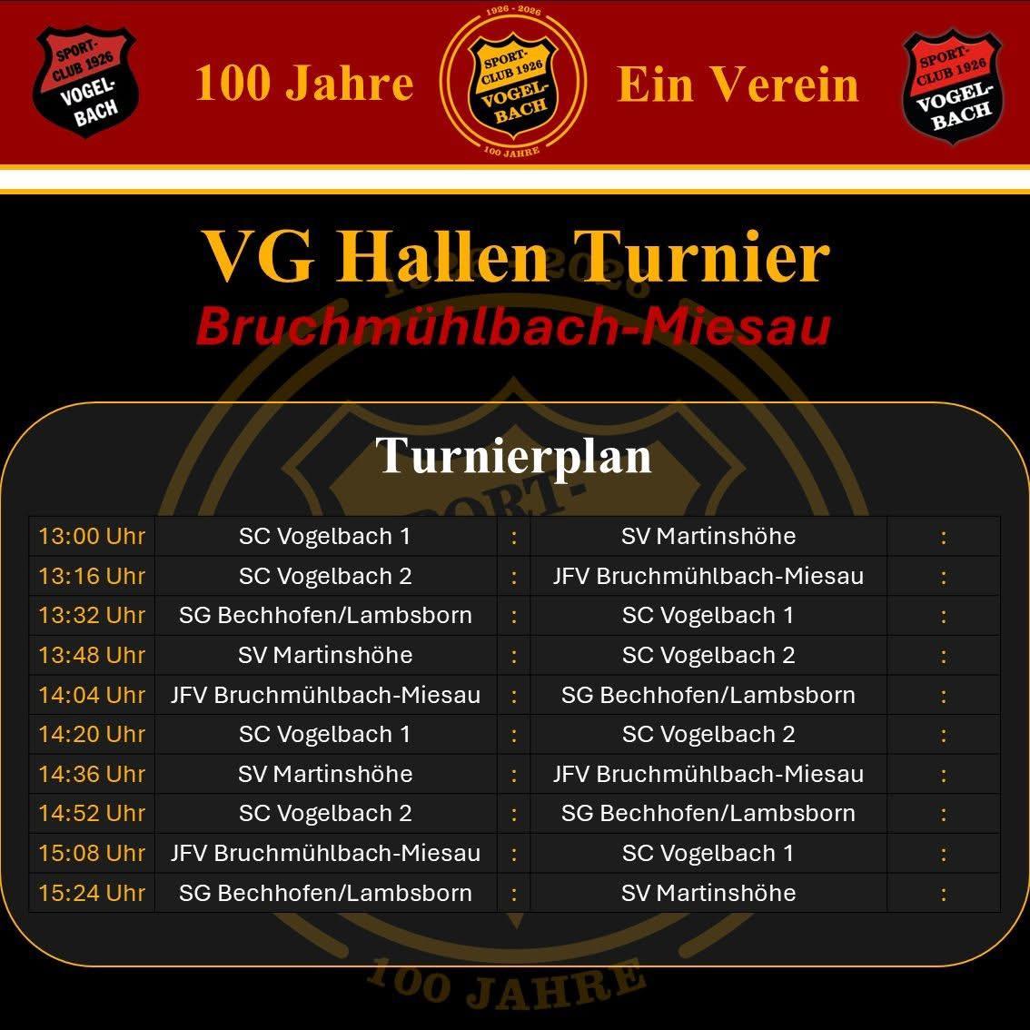 Am Sonntag, den 11. Januar 2026, fand dieses Jahr erneut das Hallenturnier der lokalen Fußballvereine statt. Ausrichter der VG-Turniere ist im Jahr 2026 aufgrund des 100-jährigen Jubiläums des Vereines der SC Vogelbach. Veranstaltungsort war die Schulsporthalle der Adam-Müller-Schule in Miesau.